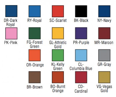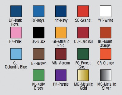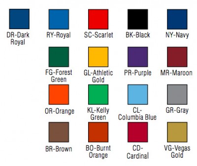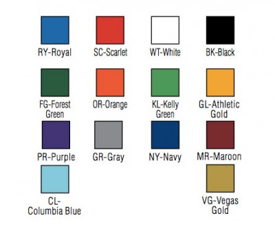 While it is theoretically possible to print any color with our 5-color Sport Pride graphic printing process, refer to the chart on the left as a basic guide to color selection. Our graphic designers will work with you for a final color and design selection. Sport Pride graphic printing is available on gym and outdoor wall padding, scoring tables and some additional padding products. Inquire about custom color availability.
